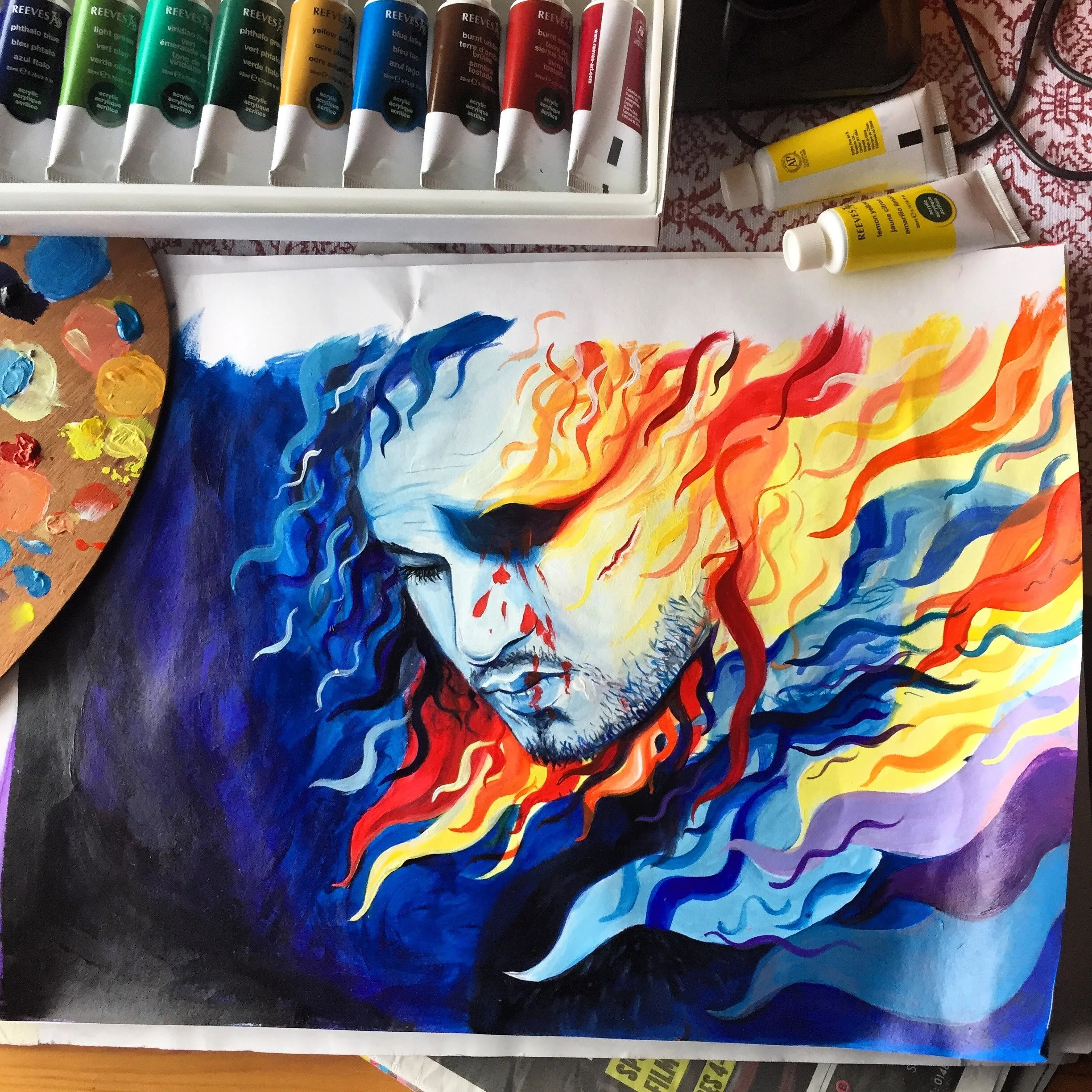 Painted using oil, and acrylic paints. I’ve recently really enjoyed creating a texture with the paint, and using unconventional colours for the undertones of the image.
